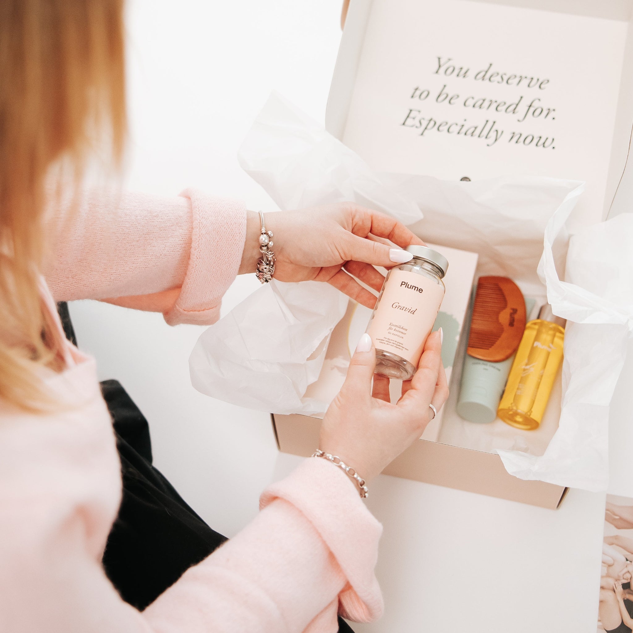 Plume Gravid Kit Deluxe är ett noggrant sammansatt kit med produkter som är framtagna för att stötta kroppen under graviditeten och göra din vardag lite lättare. Här har vi samlat flera produkter som många uppskattar under graviditeten – allt i ett och samma kit.